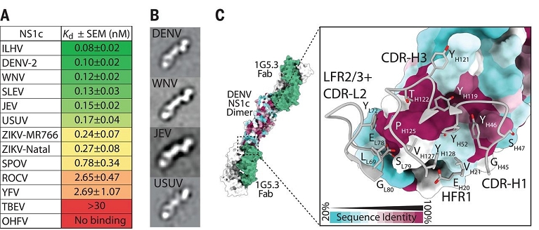 此项研究首次对广谱保护性NS1单克隆抗体进行了结构表征,揭示了交叉保护的分子基础以及保护性抗体的作用机制,为黄病毒通用疫苗的设计提供了新思路。